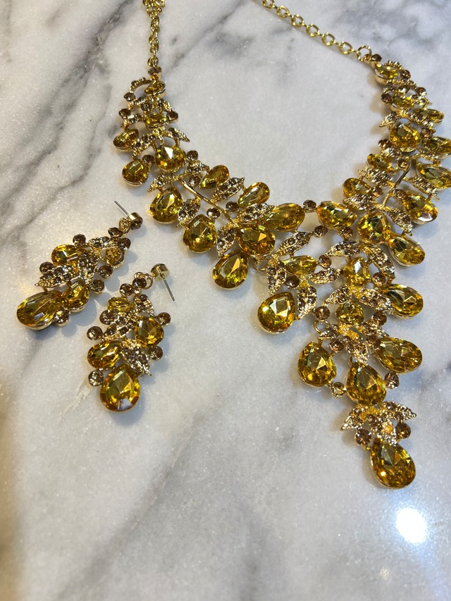 甘く華やかな輝きを放つゴールドビジューセット。ブライダルやパーティー、特別なイベントにぴったりのアクセサリーです。 ピアス、ネックレス、のセットで揃っており、トータルコーディネートが簡単に完成します。 素材には高品質なクリスタルストーンを使用しており、一粒一粒が美しい輝きを放ちます。繊細なデザインとゴージャスな装飾が相まって、存在感抜群のアイテムとなっています。 このゴールドビジューセットは、特別な日をより華やかに演出してくれるでしょう。 ぜひこのセットを身につけ、素敵な一日をお過ごしください♡ ※ご使用中のジュエリーは汗や水分、香水などで変色する場合がありますので、ご注意ください。 ※海外製品の為細かいキズやスレなどがある場合がございます。 ご理解いただいた上でご購入ください